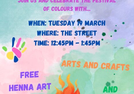 Join us in the Street on Tuesday 19 March from 12:45pm – 1:45pm to celebrate the Festival of Colours with FREE henna art, arts and crafts and more…